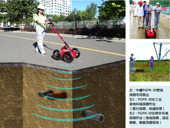 PGPR-30管線探測專用雷達是為精確探測和定位各類金屬、非金屬管線而設計的新型專用設備,由一體化主機、高性能屏蔽式天線、三防顯控終端和四輪(可切換兩輪)手推車等部件組成,便于攜帶作業(yè)、操作簡單、探測結果易于識別判讀,是目前性能先進、使用方便的國產(chǎn)管線探測雷達??蓮V泛應用于管線普查和詳查、工程管線定位、環(huán)保監(jiān)督等各個領域。